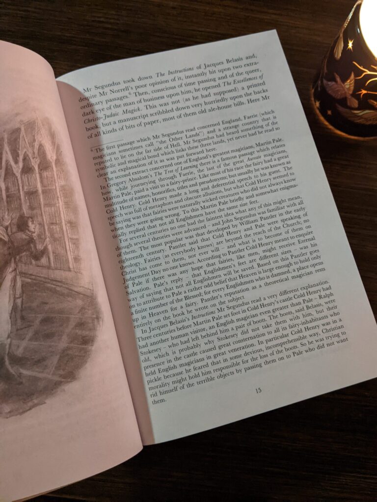 The prose, oh, the prose! Clarke’s writing is delightfully old-fashioned, perfectly suiting the time period of the novel. The adherence to older language conventions and spellings — “connexions,” “any one,” “shewed” as the past tense of “show,” etc. — gives the work a very immersive and realistic feel. I also thoroughly enjoyed the footnotes relating to various in-universe texts, which create a scholarly air while also injecting some delightful humor (see, for instance, the page below that’s almost entirely taken up by the footnote).